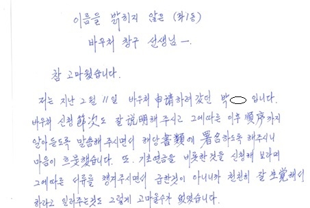 이 민원인은 2월 초 안마바우처를 신청하러 센터를 찾았다가 김 씨의 도움을 받았다. 김 씨는 신청 절차를 상세히 설명하는 것은 물론, 민원인이 몰랐던 기초연금 신청까지 안내하며 필요한 서류를 챙겨주는 등 적극적으로 지원했다. 이에 감동한 민원인은 “참 고마웠습니다”라는 말로 시작하는 장문의 편지를 통해 감사의 뜻을 전했다.