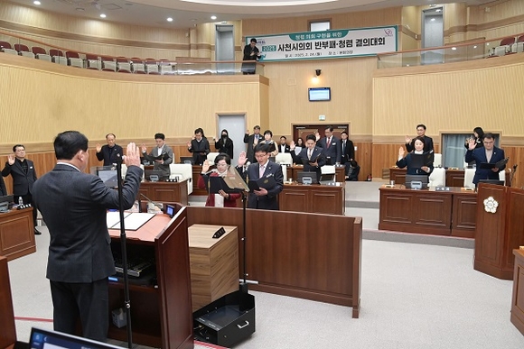 사천시의회는 제281회 임시회 첫날인 24일 본회의장에서 의원 및 직원 전원 40명이 참석한 가운데 '2025 사천시의회 반부패·청렴 실천 결의대회'를 가졌다.