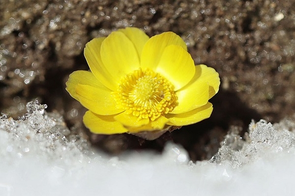 포근한 날씨를 보인 25일 경남 함양군 병곡면 대봉산휴양밸리에서 복수초가 쌓인 눈을 비집고 노란 꽃망울을 터뜨리고 있다. (사진=함양군 제공)