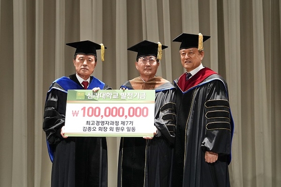 이날 수료하는 최고경영자과정 7기 원우회가 준비한 발전기금 1억원은 신라대학교 발전과 미래 세대 리더들에게 양질의 교육이 제공되길 바라는 마음으로 전달돼 그 의미가 크다.