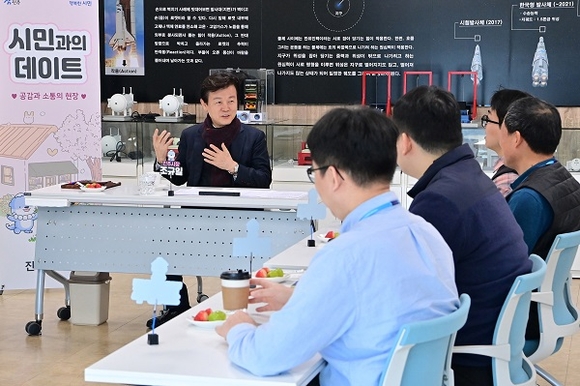조규일 진주시장은 26일 한국산업기술시험원(KTL) 우주부품시험센터 2층 대회의실에서 진주시 초소형위성인 'JINJUSat-1B(진주샛 원 비)' 개발사업 관계자 8명과 2월 시민과의 데이트 시간을 가졌다.