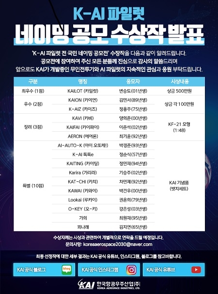 네이밍 공모전 결과는 KAI 공식 홈페이지와 SNS 채널을 통해 확인이 가능하다.