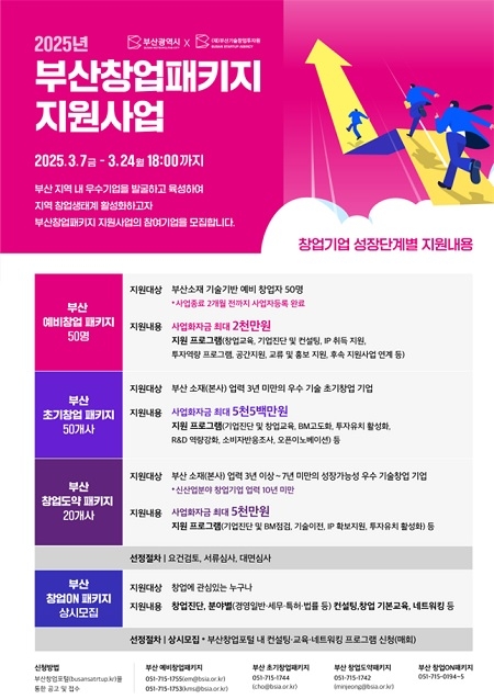 부산시는 창업기업이 지속적으로 성장할 수 있도록 단계별 맞춤형 지원을 제공하는 ‘2025년 부산창업패키지 지원사업’을 공고하고, 7일부터 오는 24일까지 참여 기업을 모집한다고 밝혔다.