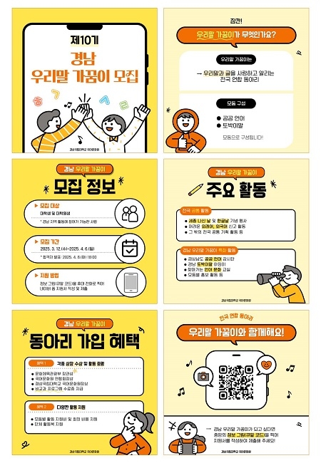 경남 지역 대학에 재학 중인 대학생 및 대학원생은 누구나 지원이 가능하며, 내달 6일까지 정보 그림(큐알 코드)을 찍어 네이버 폼에서 지원서를 작성해 제출하면 된다. 합격자 발표는 내달 8일 오후 6시 경상국립대 국어문화원 누리집에 게시한다.