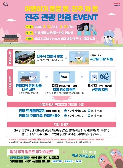 이번 이벤트는 오는 5월 31일까지 진행되며, 진주를 방문하는 관외 관광객이 진주의 관광지를 방문하고 인증하면 진주의 마스코트인 하모 굿즈를 받을 수 있다.