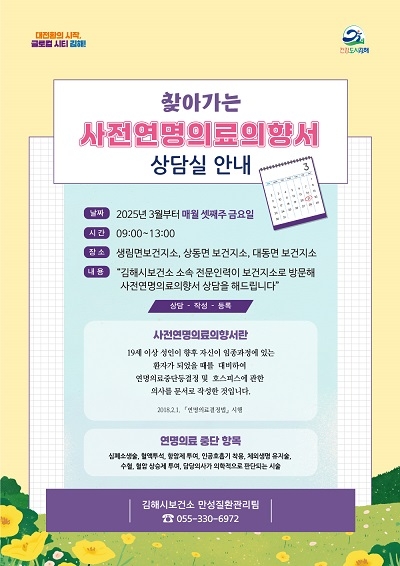 경남 김해시는 주체적 존엄한 삶의 마무리를 할 수 있는 지역 내 인프라 형성을 위해 '찾아가는 사전연명의료의향서 상담실'을 확대 운영한다고 13일 밝혔다.
