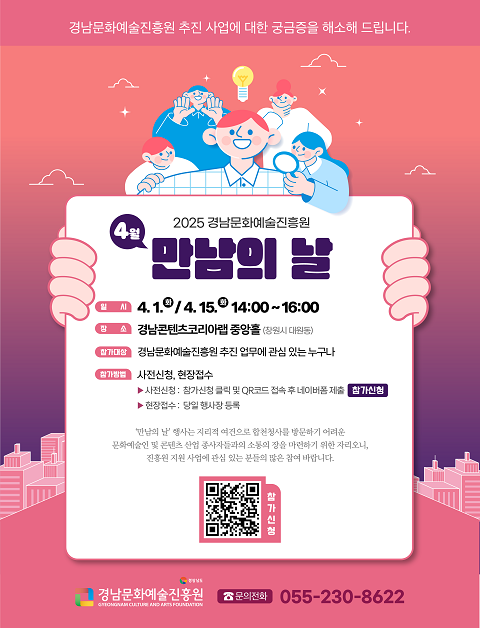 경남문화예술진흥원은 매월 1일과 15일을 ‘문화예술인 만남의 날’로 지정하고 첫 만남의 날을 내달 1일 오후 2시에 경남콘텐츠코리아랩 중앙홀에서 개최한다고 14일 밝혔다.