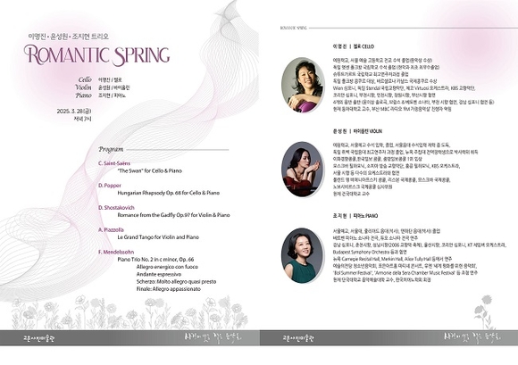 이명진·윤성원·조지현 트리오는 이날 생상스의 ‘동물의 사육제-백조(The Swan for Cello & Piano)’, 포퍼의 ‘헝가리안 랩소디(Hungarian Rhapsody Op. 68 for Cello & Piano)’, 쇼스타코비치의 ‘로망스(Romance from the Gad y Op.97 for Violin & Piano)’, 피아졸라의 ‘위대한 탱고(Le Grand Tango for Violin and Piano)’를 먼저 선보인다.