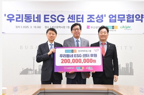 부산시가 18일 현대백화점그룹과 강서구와 함께 ‘우리동네 사회가치경영(ESG) 센터’ 6호점 조성을 위한 업무협약 및 기부금 전달식을 개최했다. 이날 행사에는 박형준 부산시장, 장호진 현대지에프홀딩스 대표이사, 김형찬 강서구청장이 참석해 협력 의지를 다졌다.