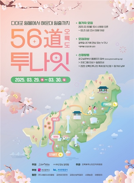 부산시가 오는 29일 오후 6시, 다대포해수욕장에서부터 해운대해수욕장까지 56km를 걷는 ‘오륙도 투나잇’ 행사를 연다. 이번 행사는 5색(色)의 길과 6락(樂)의 즐거움을 결합한 걷기 축제로, 무박 2일 동안 부산의 자연과 도시 풍경을 몸소 체험할 수 있도록 기획됐다.