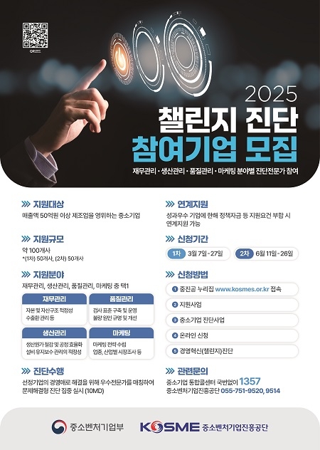 중소벤처기업부와 중소벤처기업진흥공단은 중소·벤처기업 경영애로 해소를 통한 위기 극복 및 기업 경쟁력 강화를 위한 ‘2025년 챌린지진단 1차 참여기업’을 모집한다고 19일 밝혔다.