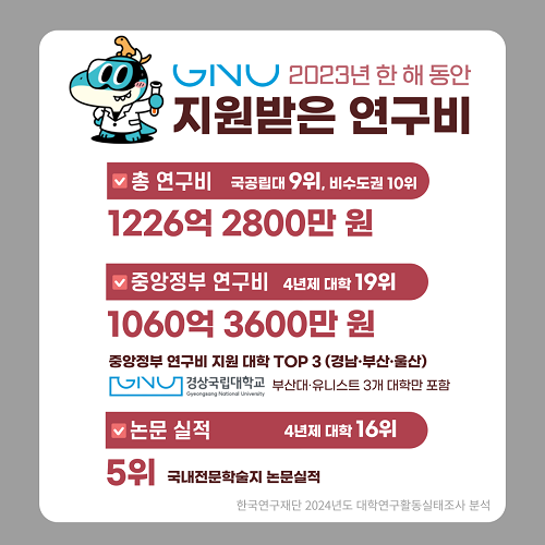 분석보고서에 따르면 경상국립대가 2023년 한 해 동안 지원받은 전체 연구비는 1226억 2800만 원으로 나타났다. 이는 국공립대 가운데 9위이고, 비수도권 대학으로서는 10위이다. 전체 교원 1037명 가운데 576명이 연구책임자로 참여했다.