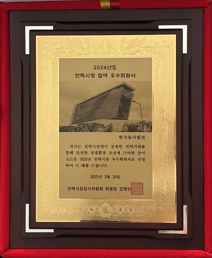 한국동서발전은 공정한 전력거래 활성화와 임직원의 전력시장 감시 관련 강한 의지 및 적극적인 참여를 통한 성과 등을 인정받아 전력시장감시위원회로부터 ‘2024년도 전력시장 감시 우수회원사’로 선정됐다고 20일 밝혔다.