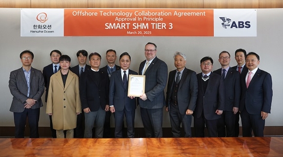한화오션은 미국 선급 ABS로부터 ‘스마트 선체 구조 건전성 모니터링 티어 3(Smart Structural Health Monitoring Tier 3)’에 대한 개념 승인(AiP, Approval in Principle)을 획득했다고 21일 밝혔다.