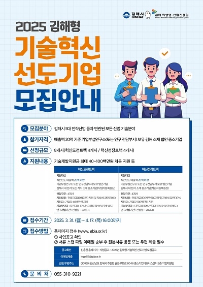 김해의생명산업진흥원은 오는 4월 17일까지 김해시 관내 소재 법인 중소기업을 대상으로 '2025년 김해형 기술혁신 선도기업 육성사업'에 참여할 기업을 모집한다고 21일 밝혔다.