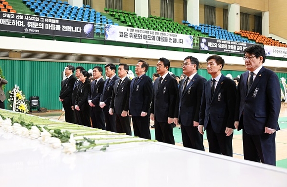 경남도의회 최학범 의장과 도의원 14명은 24일 오전 9시 20분 창녕군민체육관에 마련된 산청 산불 진화대 사고 희생자(창녕군 소속) 합동분향소를 찾아 조문했다.