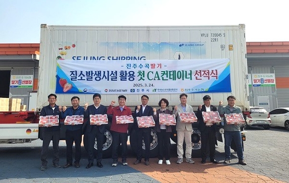 경남 진주시는 24일 진주수곡농협수출농단 선별장에서 CA(Controlled Atmosphere) 컨테이너를 활용한 금실딸기 첫 선박 수출 선적식을 가졌다.