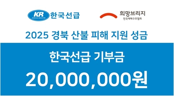 한국선급(KR)이 27일 경북, 경남, 울산지역의 산불 피해 복구를 위해 총 2000만원의 성금을 희망브리지 전국재해구호협회에 전달했다고 밝혔다.