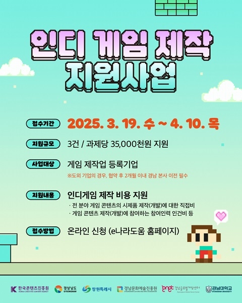 경남문화예술진흥원은 창의적인 아이디어와 역량을 갖춘 지역 개발자 육성 및 경남 게임산업의 다양성 확보를 위한 ‘인디게임 제작 지원사업’에 참여할 기업을 내달 10일까지 모집한다고 28일 밝혔다.