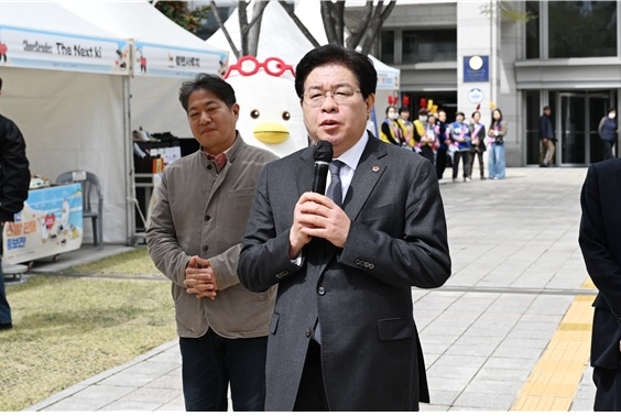 안성민 부산시의회 의장이 28일 시청 2층 시민광장에서 열린 시민과 함께하는 '부산 신발 판매⋅홍보전'을 방문해 참여기업을 격려했다.