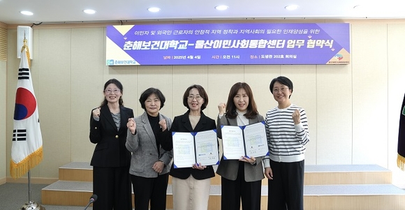 춘해보건대학교는 4일 본교 도생관 대회의실에서 울산이민사회통합센터와 업무협약을 체결하고, 이민자 및 외국인 근로자의 안정적인 지역 정착과 지역사회 수요에 부합하는 전문 인력 양성을 위한 협력체계를 구축했다고 밝혔다.