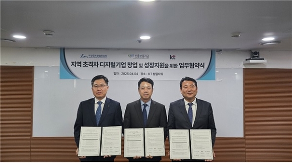 부산정보산업진흥원이 4일 신용보증기금 부산경남영업본부, KT 부산경남법인고객본부와 지역 디지털 기업의 창업과 글로벌 성장을 지원하는 업무협약(MOU)을 체결했다고 밝혔다.