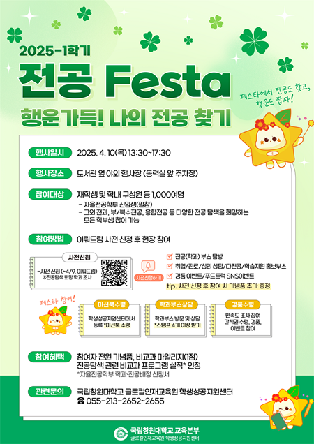 ‘2025 전공 페스타’는 국립창원대 학부 재학생이라면 누구나 참여 가능하며, 사전 신청은 국립창원대 이뤄드림에서 가능하다. 보다 자세한 사항은 국립창원대 교육본부 글로컬인재교육원 학생성공지원센터로 유선문의하면 된다.