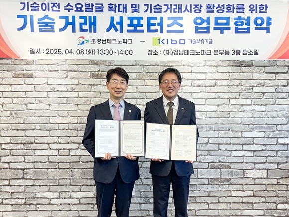 기술보증기금이 지난 8일 경남테크노파크와 경남TP 본부에서 '기술이전 수요발굴 확대 및 기술거래시장 활성화를 위한 기술거래 서포터즈 업무협약'을 체결했다고 밝혔다.