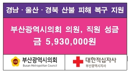 부산시의회 의원과 사무처 직원들은 산불 피해를 입은 주민들께 위로의 마음을 전하고 피해복구에 힘을 보태고자 성금 모금을 하게 됐고, 이번 성금은 대한적십자사를 통해 경남도 산청군, 경북도 의성군, 울산시 울주군 등 전국 각지에서 발생한 대형 산불 피해 이재민을 위한 생필품과 구호품 지원 등에 사용될 예정이다.
