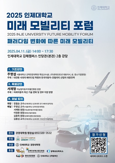 인제대학교는 오는 11일 오후 2시부터 본관 2층 강당에서 김해지역 자동차 부품 기업의 생존 전략을 모색하는 ‘2025 인제대학교 미래 모빌리티 포럼'을 연다고 9일 밝혔다.