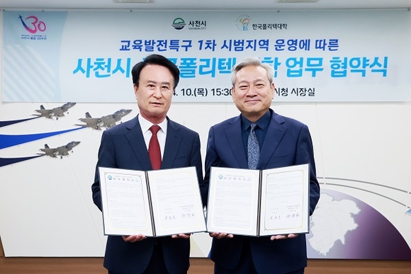 경남 사천시는 10일 교육발전특구 시범지역 사업 추진을 위해 지역 우주항공대학인 한국폴리텍대학 항공캠퍼스와 업무협약을 체결했다고 밝혔다.