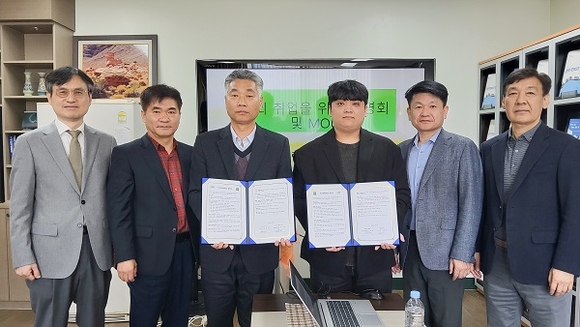 8일 교내 미래항공융합관에서 OJNT 신준호 이사(오른쪽 세 번째)와 항공대학 교수들이 모여 업무협약을 체결한 뒤 기념촬영을 하고 있다.(사진=신라대 제공)