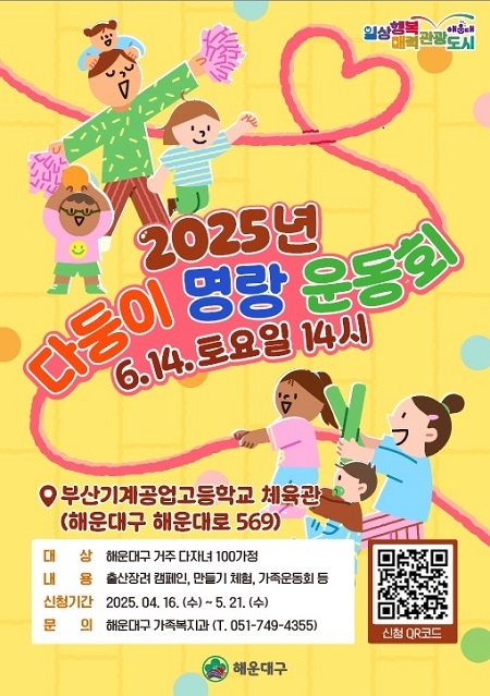 해운대구가 오는 6월 14일 부산기계공업고등학교 체육관에서 열리는 2025년 ‘다둥이 명랑 운동회'에 참가할 가족을 모집한다고 15일 밝혔다.