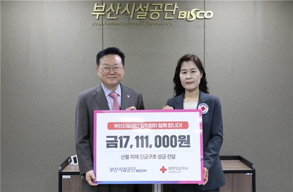 부산시설공단이 전국적인 산불 피해 지역의 복구와 이재민 지원을 위해 총 1711만1천 원의 성금을 대한적십자사에 전달했다고 15일 밝혔다.