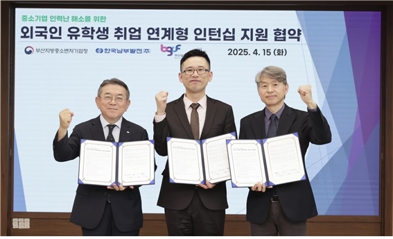 남부발전은 15일 부산 본사에서 김준동 사장, 강기성 부산지방중소벤처기업청장, 전용우 부산글로벌도시재단 대표 등 20여명이 참석한 가운데 ‘외국인 유학생 취업연계형 인턴십 지원사업’ 3자 협약을 체결했다고 밝혔다.