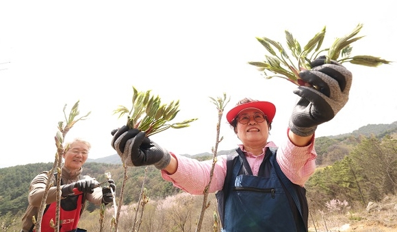 16일 완연한 봄날씨를 보인 경남 함양군 안의면 상비마을 해발 600m 해림농원에서 류재응씨 부부가 '음나물'을 첫 수확하고 있다. (사진=함양군 제공)