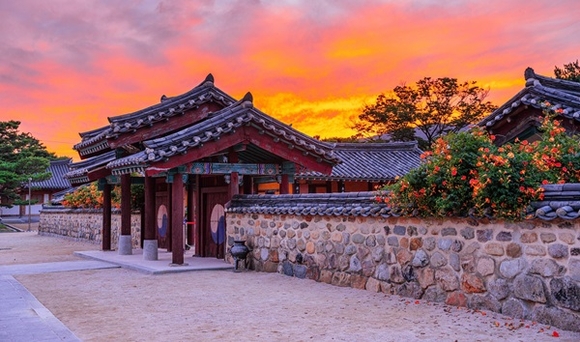 ◇(김해) 수로왕릉 능소화= 늦봄, 김해 수로왕릉의 담벼락에 피어나는 주황색 능소화는 붉은 노을처럼 강렬하게 빛난다. 그 화려한 꽃길을 따라 걸으며, 고요한 봄날의 정취를 만끽해 보자. 고요하지만 강렬한 자연의 색감이 여행객의 마음을 사로잡을 것이다.