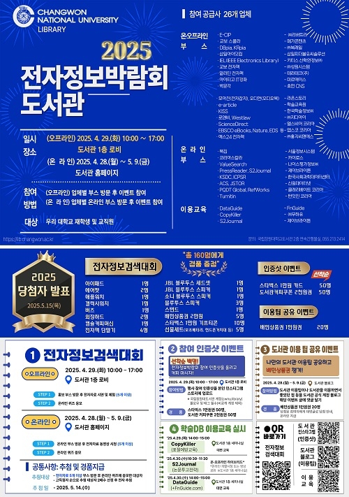 국립창원대학교 도서관은 28일부터 내달 9일까지 ‘2025 국립창원대학교 도서관 온·오프라인 전자정보박람회’를 개최한다고 밝혔다.