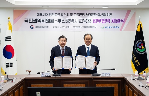 부산시교육청이 지난 25일 시교육청 제1회의실에서 국민권익위원회와 청렴인재 양성 및 교육현장 청렴문화 확산을 위한 업무협약(MOU)을 체결했다고 밝혔다.