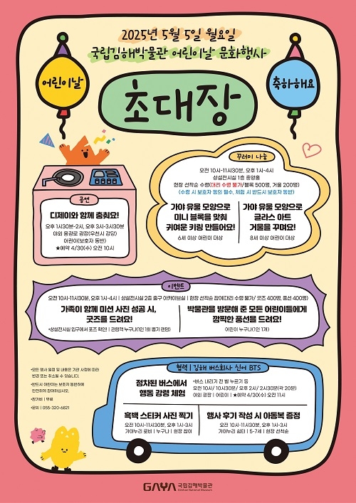 국립김해박물관은 어린이날을 맞이해 내달 5일 오전 10시부터 11시30분까지, 오후 1시부터 4시까지 박물관 일원에서 어린이날 문화행사 '어린이날, 축하해요!'를 개최한다고 29일 밝혔다.