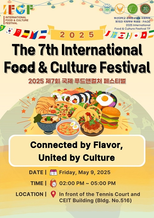 부산대 경제통상대학은 부산대에 재학 중인 외국인 유학생들과 재학생들이 함께하는 '제7회 국제 푸드앤컬처 페스티벌(The 7th Food & Culture Festival)'을 오는 9일 오후 2시부터 5시까지 경제통상관 인근 야외에서 개최한다고 7일 밝혔다.
