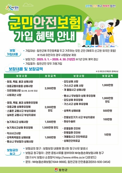 경남 합천군은 군민들의 안전을 위해 이달부터 1년간 전 군민을 대상으로 '군민안전보험'을 시행한다고 7일 밝혔다.