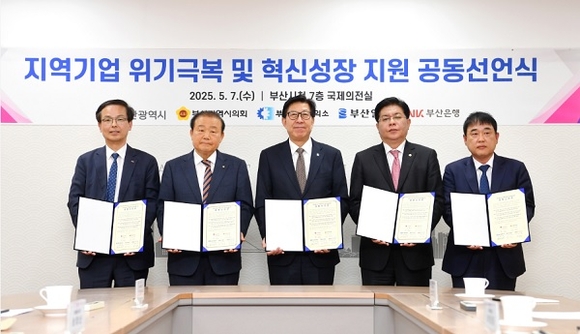 부산시는 7일 시청 국제의전실에서 '지역기업 위기 극복 및 혁신 성장지원을 위한 공동선언식'을 개최했다고 밝혔다. 이번 선언식에는 박형준 부산시장, 안성민 부산시의회 의장, 부산상공회의소, 부산일보, BNK부산은행 등 5개 기관 대표가 참석해 민관이 손잡고 지역경제 활력 회복에 총력을 기울이겠다는 공동의지를 천명했다.