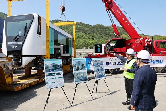 경남 양산시는 8일 오전 양산도시철도(부산 금정구 노포동~양산시 북정동) 경전철 차량 1개 편성(2량)이 양산선 차량기지에 첫 반입됐다고 밝혔다.