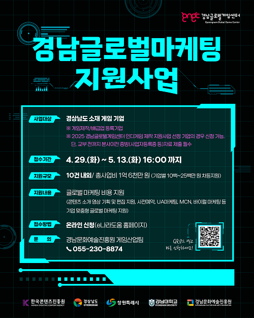경남도와 경남문화예술진흥원은 도내 게임 기업의 게임 콘텐츠 국내외 인지도 향상을 위한 ‘2025 경남글로벌게임센터 글로벌 마케팅 지원사업’에 참여할 기업을 오는 13일까지 모집한다고 8일 밝혔다.