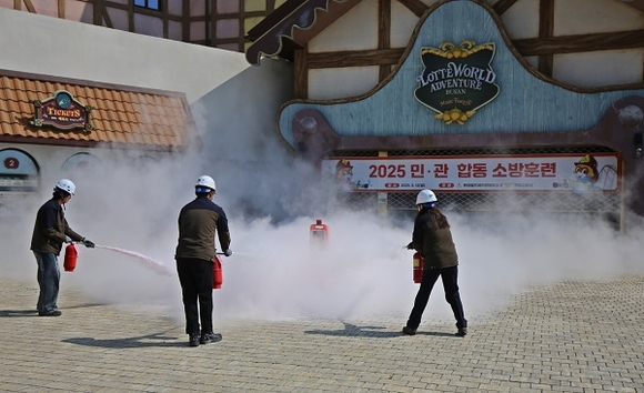 롯데월드 어드벤처 부산이 본격적인 나들이 철을 맞아 손님들의 안전한 테마파크 이용을 위해 기장소방서와 함께 민·관 합동 소방 훈련을 실시했다. 이번 훈련은 12일 롯데월드 부산 현장에서 진행됐다.