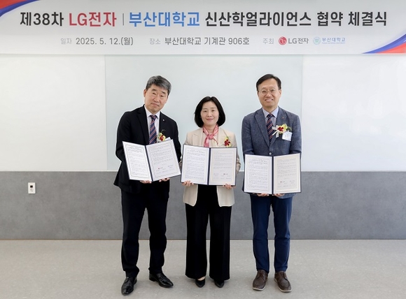 12일 열린 LG전자-부산대 간 신산학얼라이언스 협약 체결식에서 (왼쪽부터)이현욱 LG전자 HS연구센터장, 강정은 부산대 산학협력단장, 오세기 LG전자 ES연구소장이 기념촬영을 하고 있다.(사진=부산대 제공)