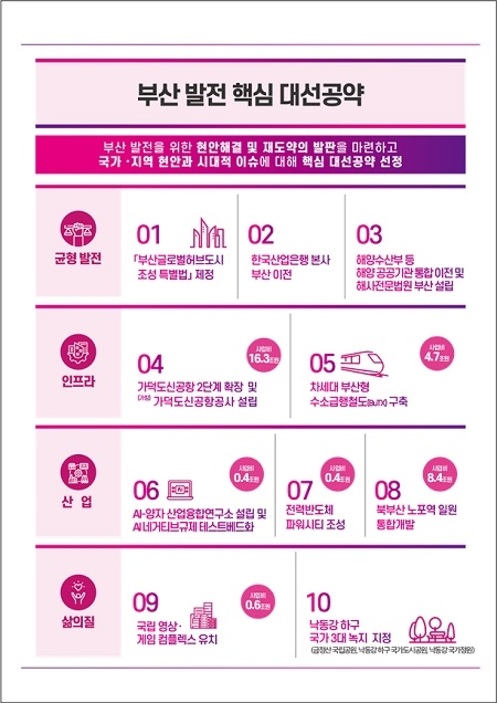 해당 공약 과제는 부산시가 지난달 21일 공개한 ‘대선공약 제안과제’로, 총 사업비는 약 140조 원 규모에 이른다. 시는 이를 바탕으로 정당과의 공감대를 조성했고, 현재는 서울본부를 중심으로 중앙당 및 중앙부처와의 협의도 활발히 진행 중이다. 시 본청 각 실·국·본부장이 직접 정부 부처를 방문해 공약 채택의 필요성을 설명하는 등 발로 뛰는 행정이 이어지고 있다.