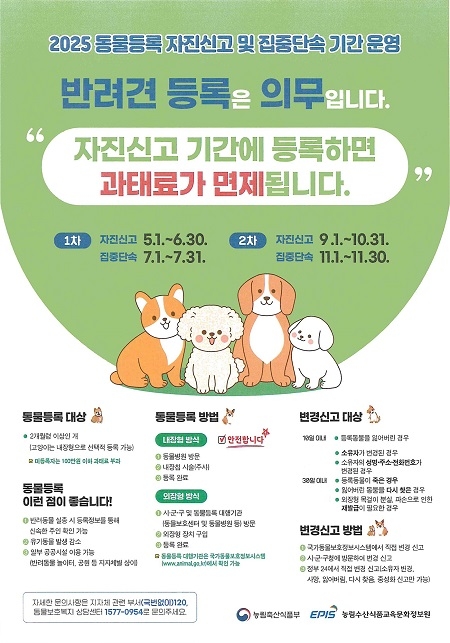 1차 신고 기간은 5월 1일부터 6월 30일까지, 2차는 9월 1일부터 10월 31일까지다. 이 기간 동안 미등록 반려동물에 대한 등록과 소유자 변경, 사망 등 변경사항 신고를 자진 접수한다.