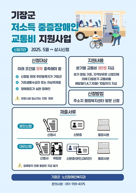 부산 기장군이 지역 내 저소득 중증장애인의 경제적 부담을 완화하고 지역사회 접근성을 높이기 위해 5월부터 ‘저소득 중증장애인 교통비 지원사업’을 추진한다고 15일 밝혔다.